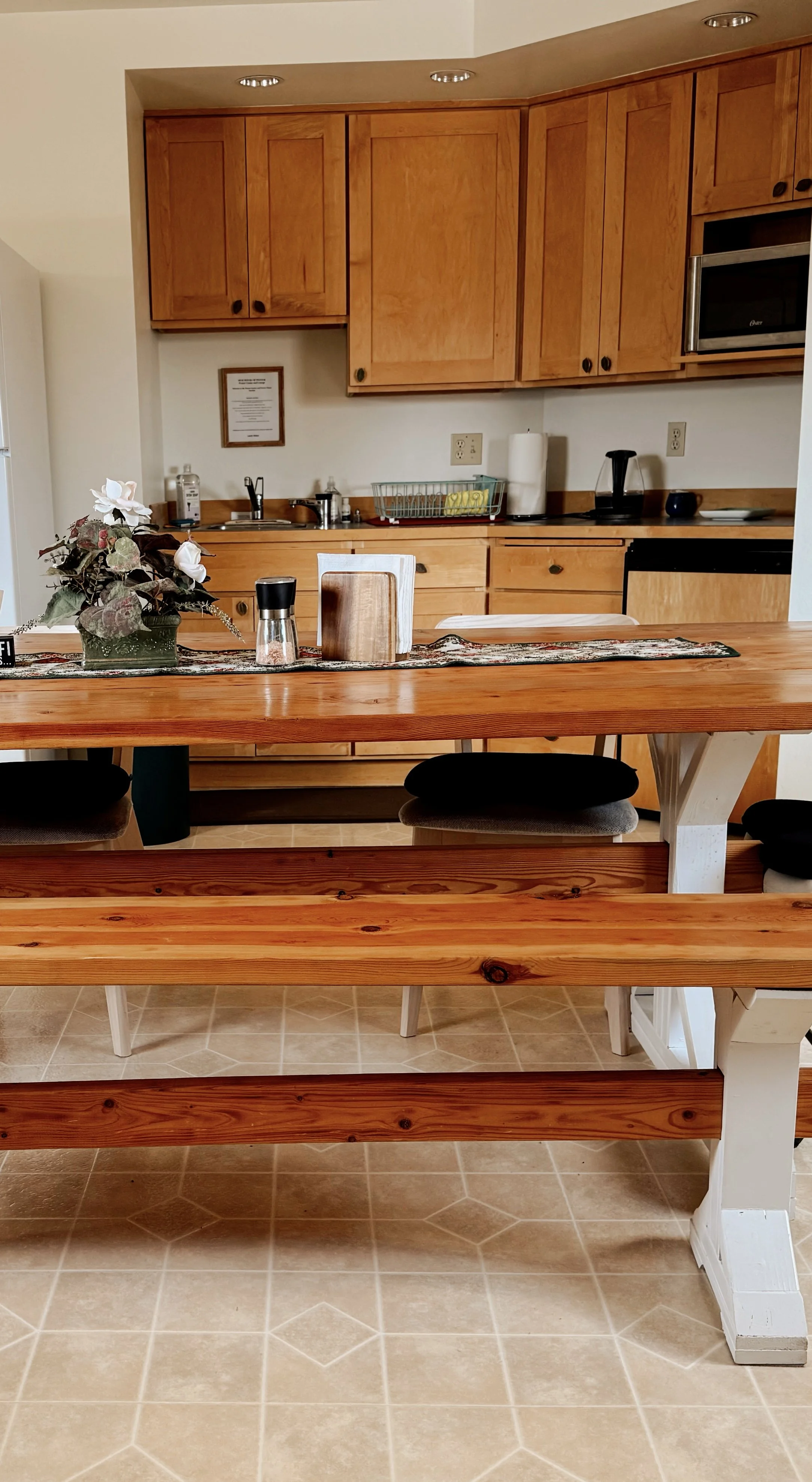 Lounge room with queen hide-a-bed, half-bath off a furnished kitchenette with dining area. The Prayer Center is above the lounge.